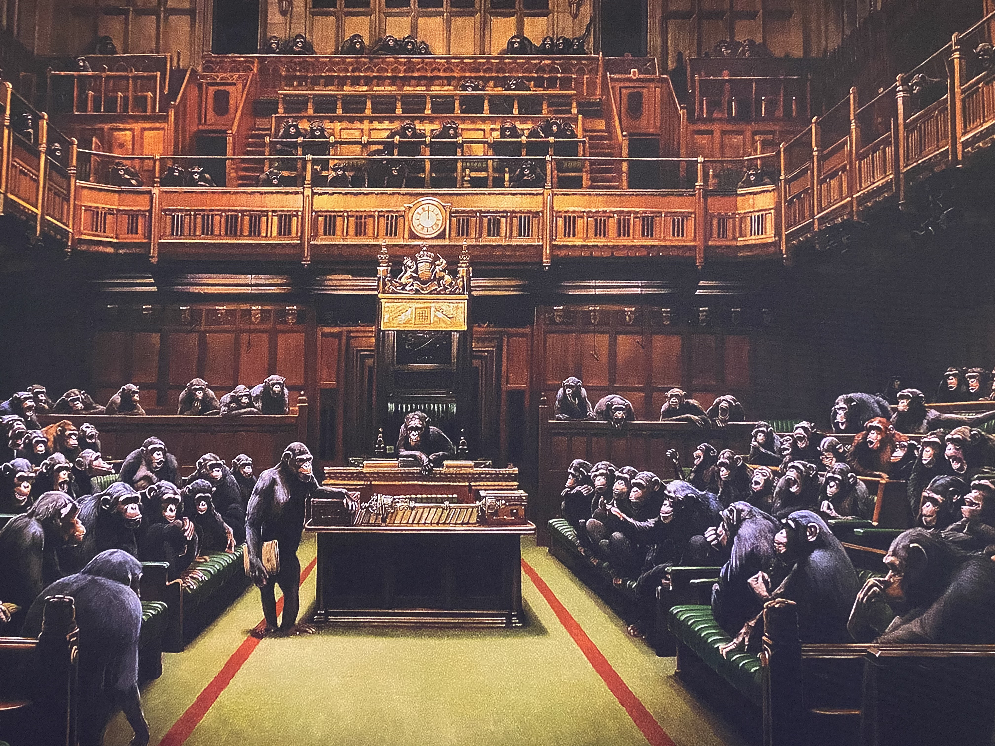 PS: Das nachfolgende Bild das ich heute in der „Banksy – A Genius Mind“ Ausstellung in Heidelberg gesehen habe, könnte auch einen Schnappschuss aus dem deutschen Parlament bei der Diskussion für die Handhabung von Covid-19 darstellen.